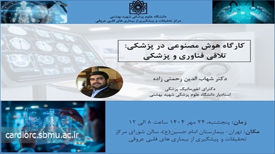 کارگاه آموزشی یک روزه با عنوان " هوش مصنوعی در پزشکی : تلاقی پزشکی و فناوری" در 24 مهرماه در مرکز تحقیقات پیشگیری از بیماری های قلب و عروق برگزار می گردد.